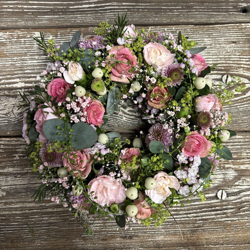Gestecktes Blumenkränzli mit diversen Schnittblumen, deren Auswahl je nach Saison und Verfügbarkeit variiert.